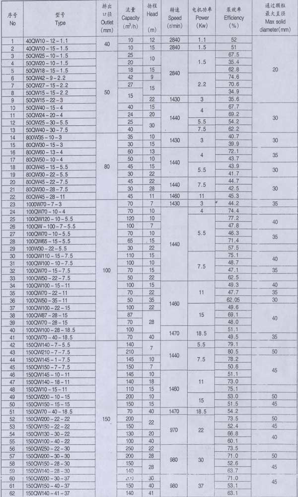 QW型系列混流式潛水泵系單級、單吸、軸向吸入、立式、機(jī)電一體、葉輪與電機(jī)軸直聯(lián),潛入泥漿、原油或清水等介質(zhì)中工作,輸送介質(zhì)的混合物比重為1:1-1:1.45。是油田石漬鉆井過程中抽送漿、清水或原油至循環(huán)泥漿池最理想的配套設(shè)備。也是電廠礦山、煉油、造紙、印染、環(huán)保、市政工程、化工、漁塘鹽廠、釀造、大理石廠、建筑、煤礦等行業(yè)抽排泥漿和污水理想的泵型。同時(shí),也可根據(jù)用戶的實(shí)際使用要求及介質(zhì)情況,設(shè)計(jì)生產(chǎn)其它規(guī)格型號產(chǎn)品.